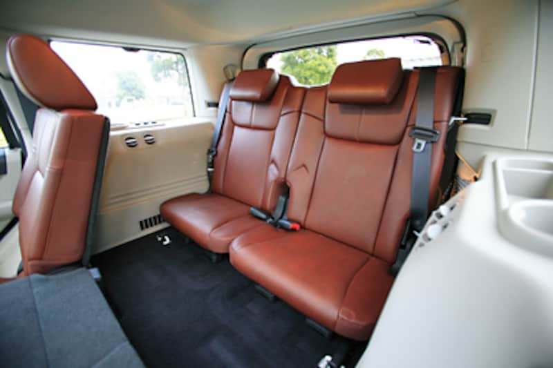 | 3列目シートは、フロアが高くなるので膝が上がってしまうが、膝前は十分なスペース。エアコンやカップホルダーも備える。 |