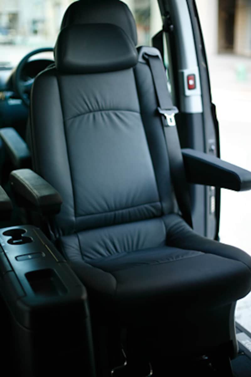 | かっちりとした一つ一つのシート。シートベルトはシート内蔵式のため、シートスライドをしても、対座でも適正な位置に装着できるのは、さすが。レザーはザクッと目が粗い質感。 |