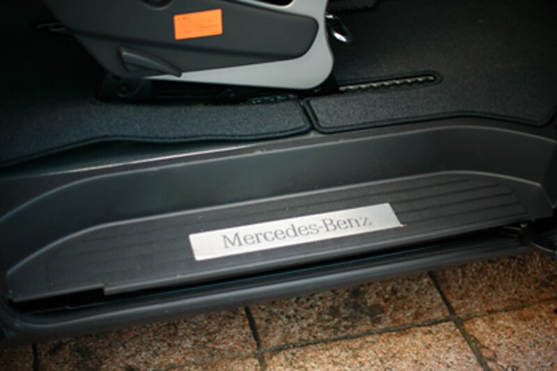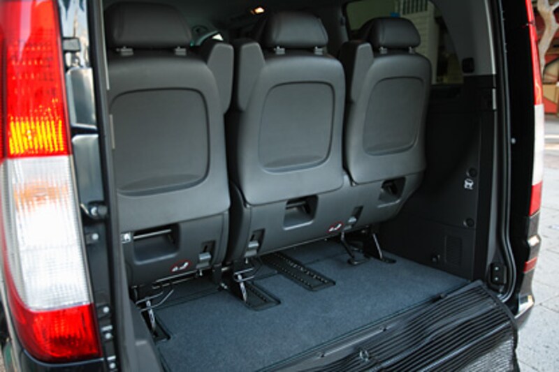 フロアは高く、ドライバーシートもリアシートも、ステップを踏んでから乗り込む形。年配の方には少々つらいか?ただ乗ってしまえばフロアはフラットで、居住性も良く室内での移動も楽。さらにはこのフラットフロアを活かして、2nd、3rdシートは前後スライド、リクライニングはもちろん、脱着もでき、2nd、3rdシートをはずせば、ラゲッジスペース容量最大4500Lの、バンのような使い方もできる。その一つ一つのシートもしっかりとした作り。この辺りはさすがメルセデス。試乗のアンビエントではシートはレザーになるが、象の肌のように目の粗いザクッとした質感は、エクステリアデザイン同様、質実剛健といった雰囲気だ。