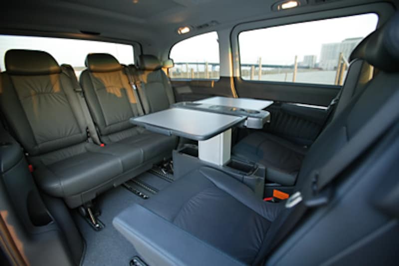 インテリアスペースは広大の一言。2ndシートは後ろ向きにし、3rdシートと対座にもできる。しかも対座にしても足元は十分な広さ。2ndシート間のスライド式のセンターテーブルを引き出せば、ノートパソコンを広げたり食事をしたりといったことができる。