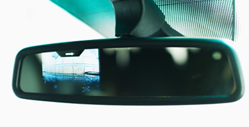 | 死角になる車両フロントサイドの視界確保は、ドアミラー部に付くカメラの映像を、ルームミラーに映し出す。しかし映像が横倒しで、車両の前方が右になるのは疑問。ナビ画面のように進む前方を上に表示した方が、違和感がないだろう。 |