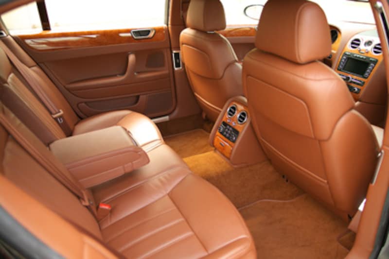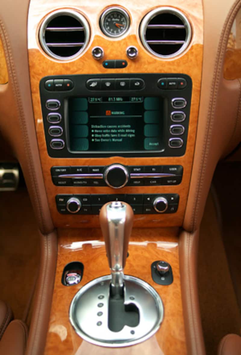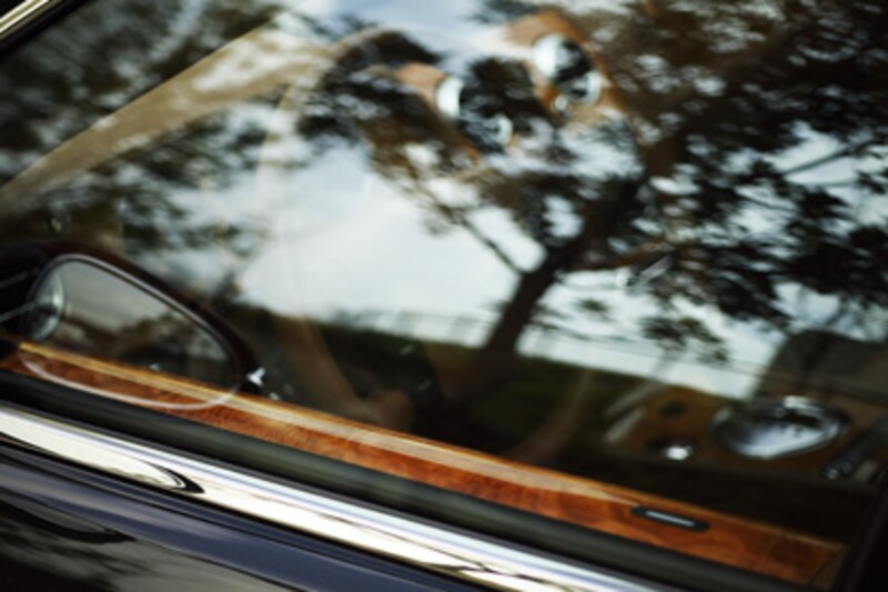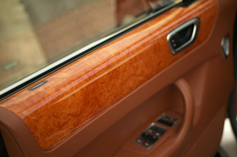 ウッドは標準で、美しい鏡面のバーウォールナット。オプションでバーズ アイ メイプル、マドローナ、ピアノ ブラック、ダーク ステインド バー ウォールナットからも選択可能。ダッシュボード、アッパードアパネル、フロント及びリアコンソールにふんだんに使われる。特にアッパードアパネルは上部まで回りこみ、厚みを感じ、車外からも覗く心憎い演習だ。