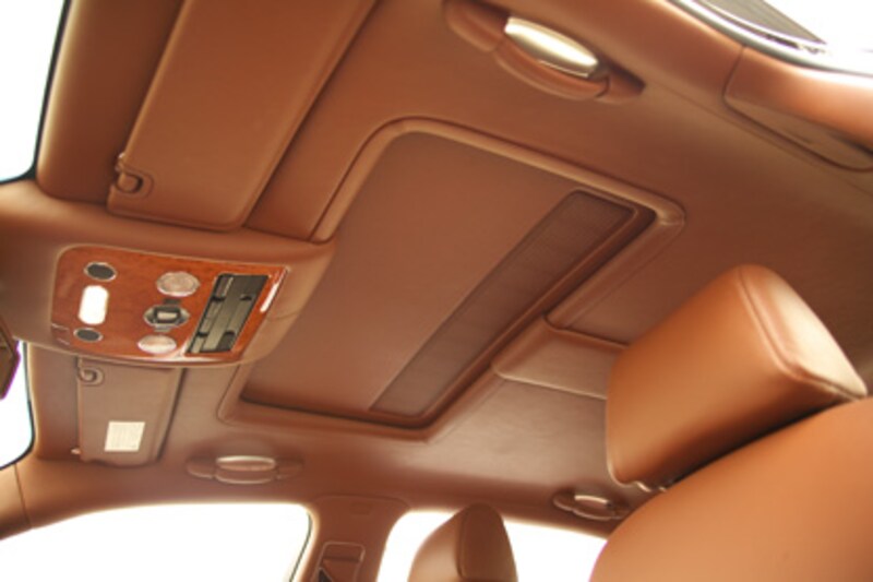 | ルーフ、サンバイザーまでレザーに覆われる。インテリアランプ周りもウッドとレザーで、丁寧にデザインされている。 |