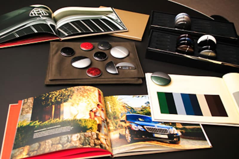 | テーブルに並べられたマイバッハのカタログ、色見本。ちなみに中央のカタログケースはヌバック製。 |