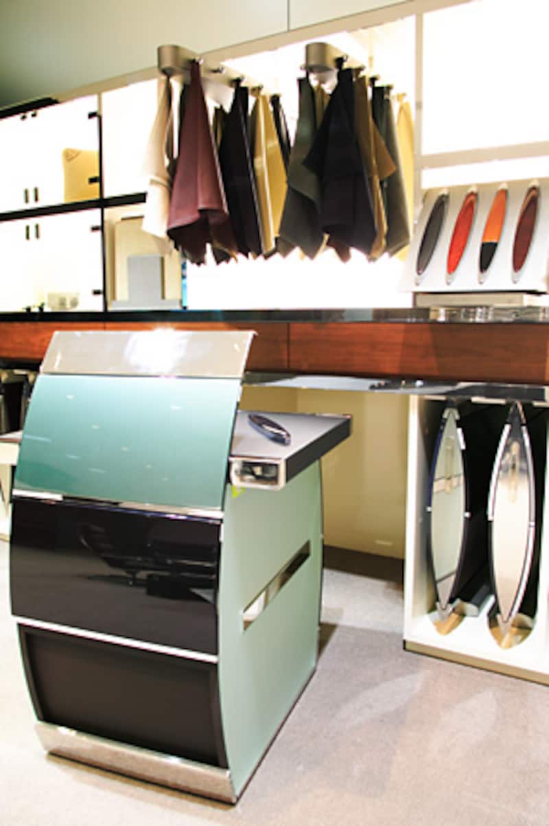 | 奥の壁が開いて現れるのは、インテリアやボディの色見本。手前のスタンドが、ボディカラーの色見本。上下を入れ替えたりして、2トーンも確認できる。 |