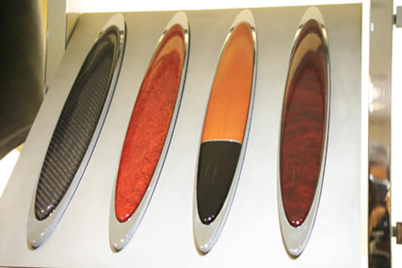 | インテリアトリムの見本。カーボン、アンボイナ、チェリー、ウォールナットから選択可能。 |