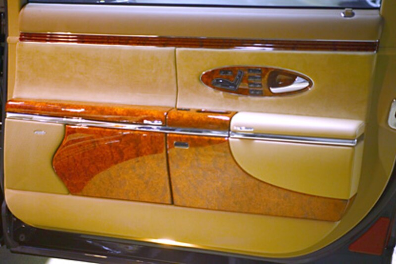 | ドア内張りもレザーとヌバック、ウッドに覆われる。ドアはどの位置で開けても、保持できる。 |