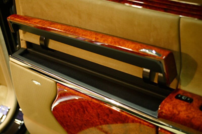 いくつかあるドアポケットの中には、浅いトレイ状のものがある。PLMの大倉さんにお聞きしたところ「女性がパーティーに出る時に、リングやピアスやネックレスなどのジュエリーアクセサリーを付け替えしまって置く場所です」。そのマイバッハのドアは、坂の途中などでも、開く角度をどの位置でも停めておくことができるストッパーがついている。ドアを開けるドライバーやホテルのドアマンをアシストし、オーナーやそのパートナーやゲストの乗り降りのしやすさを助ける。そしてドアを外から見ると、ボディ下のサイドシルまでをすっぽり覆う。「たとえば雨の中、泥をはねボディについてしまった場合でも、ドアを開けた時に、泥のついた部分は露出しません。女性がドレスで乗り降りする時にも、安心です」と大倉さん。もう世界が違う!といった雰囲気だ。