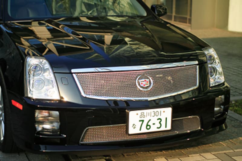 フロントはキャデラックに共通する縦目のヘッドライト。STSではクラス最大級の大型 70mm デュアルプロジェクターレンズを使う。五角形のグリルは、STS-Vではステンレス ワイヤーメッシュ製。同じくステンレスワイヤーメッシュ製のエアインテークと共に、スポーティーな雰囲気を演出する。