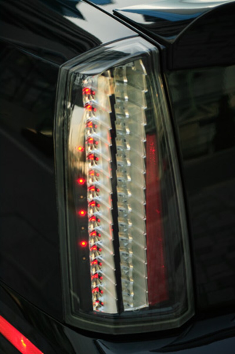 リアもフロントに呼応し、同じく縦目のテールライト。世界初となる間接照明型 LED 式テールライトだ。スポイラーに内蔵されるハイマウントストップランプは、ほぼ左右車幅いっぱいの横一文字。これもキャデラックの伝統だ。ナンバープレートベースも、フロントグリルに呼応し、わずかに五角形。