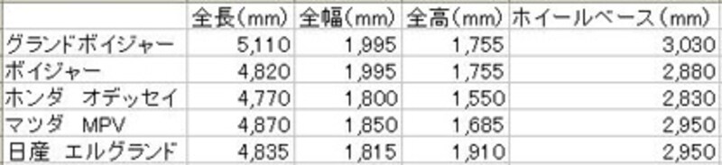 そのサイズは今回試乗のグランドボイジャーで、5,110×1,995×1,755mm(全長×全幅×全高)、ホイールベース3,030mmと、国産ミニバンより、二周りほどでかいっ!全長は300mm程度長く、メルセデスベンツSクラス並み。全幅は2mに迫り、フェラーリやロールス並み。全高も低くなってきているオデッセイなどステーションワゴンタイプの国産ミニバンと、全高の高いエルグランドなど1Boxタイプ国産ミニバンのほぼ中間。矛盾した形容だが、まさに‘ビッグ’ミニバンとも言うべきサイズだ。