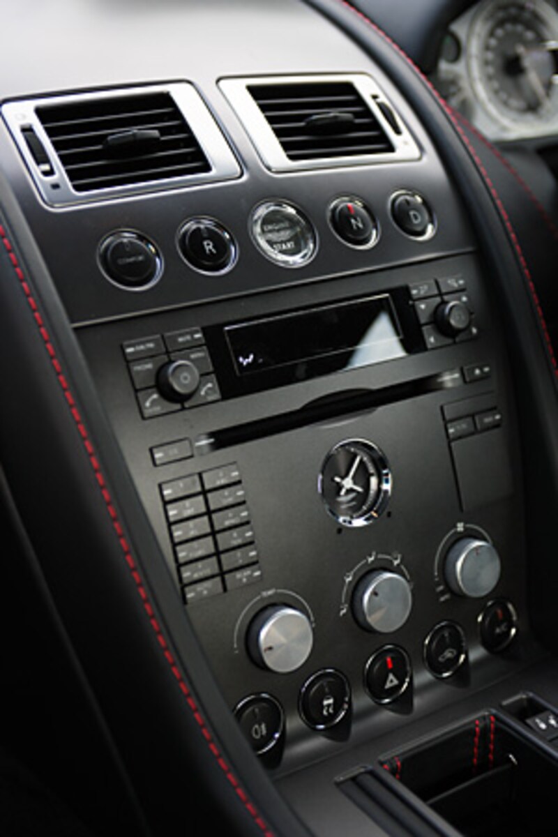 シートはフルグレインレザー(銀面革)。ヘッドライニングはアルカンタラ。試乗車では、トロレッドのエクステリアカラーに合わせたレッドのステッチが入っていた。V8 ヴァンテージは、実に20色のエクステリアカラー、インテリアでもそれぞれ別々に20色から選べるアッパーレザーカラー、ロアーレザーカラー、シートアウターカラー、シートインナーカラー、ステアリングホイールカラー、2種類のステッチのタイプ、それぞれ7色から選べるインテリアステッチカラー、シートステッチカラー、カーペットステッチカラー、8色から選べるカーペットカラー、ヘッドライニングカラー、ガンメタルとピアノブラックから選べるフェイシアトリム、2色から選べるシートベルトカラーと、正に微に入り細に入り、徹底的に自分好みのカラーコーディネイトができる。オーナーのセンスが問われる部分でもある。