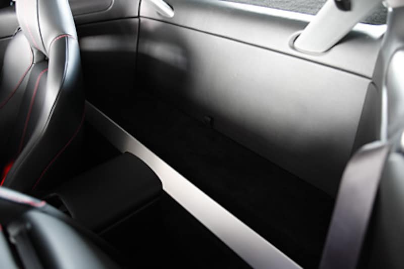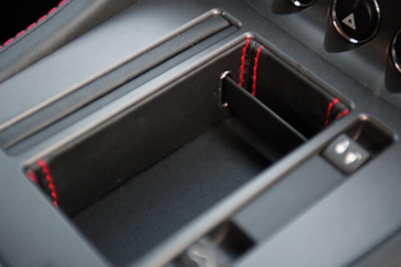 | MTではシフトノブのある位置に、スポーツシフトでは小物入れが。小物を支えるゴムバンドがおしゃれ。このゴムバンドは、トランク内サイドにも。 |