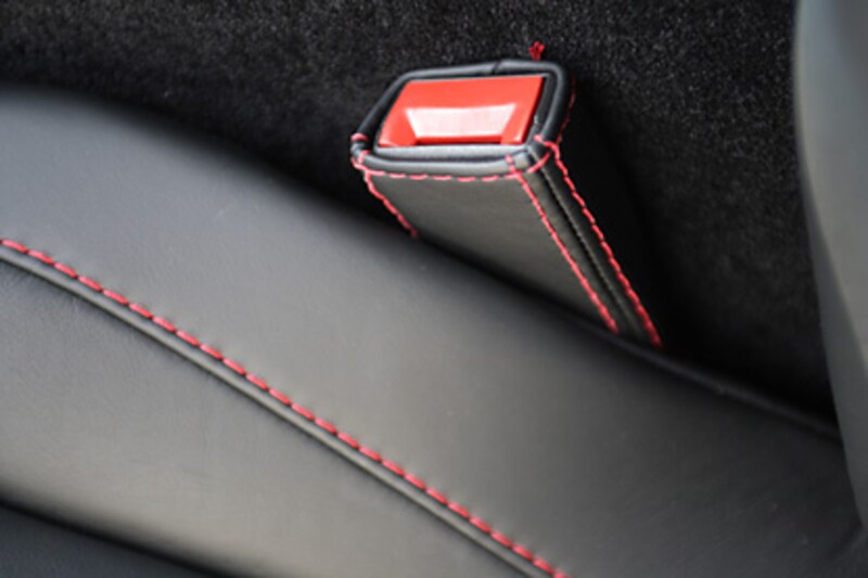 | シートベルトキャッチャーにも、レザーカバーが。試乗車は、ボディカラーに合わせたレッドのステッチ。手縫いのレザーシート。 |