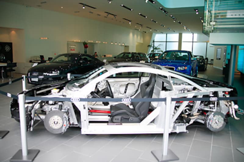 | 最新のR8のカットモデルも展示中。アルミのスペースフレーム、ドライサンプを採用し低い位置に搭載されたミッドシップのV8 4.2L FSIエンジンなどが良くわかる。 |