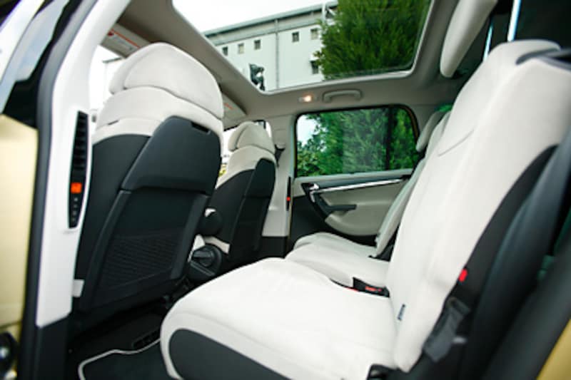 | 2列目は、3座独立してシートスライドが可能。Bピラーには、左右共エアコンのコントローラーと吹き出し口が見える。頭上には、パノラミックサンルーフ。 |