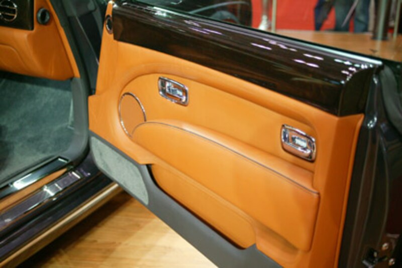 | 2ドアの長いドアには、後席の人のためのドアハンドルも見える。ドア上面には、外からも覗く厚さを感じさせるウッドトリム。ルーフライニングも、つなぎ目のないシングルピースレザーハイド。ベントレー ブルックランズの価格は4,070万円だ。 |
