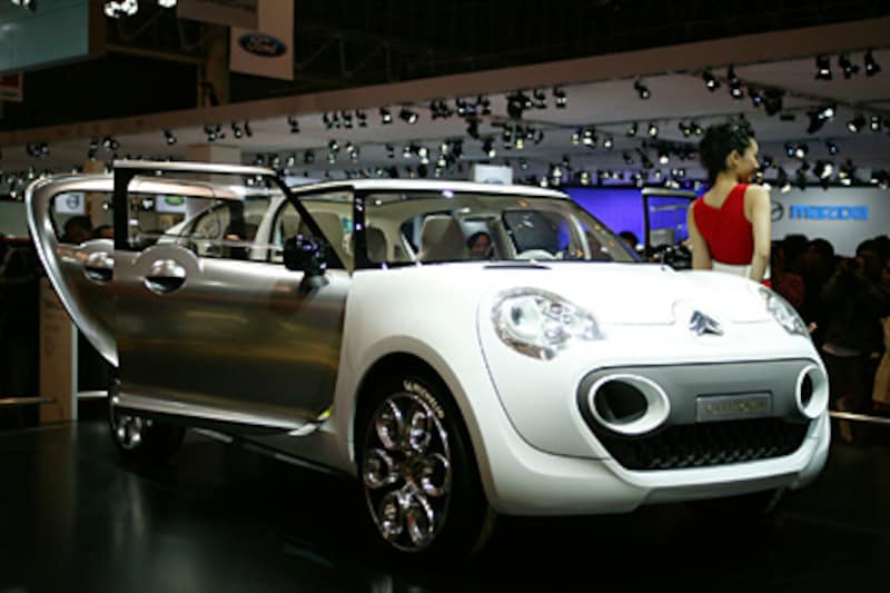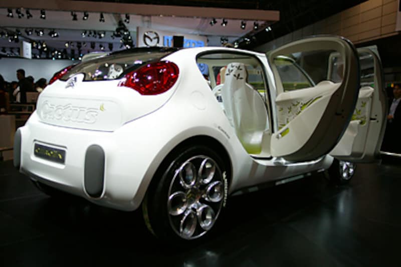 | シトロエンのコンセプトカー Cカクタス。ヘッドランプ、テールランプ、バンパー、ドアハンドル、ホイールとあらゆるところに円のモチーフが使われる。エクステリアでもできるだけ一体のパーツを使い、部品点数を減らし、空気抵抗係数、コスト、環境負荷を低減している。 |