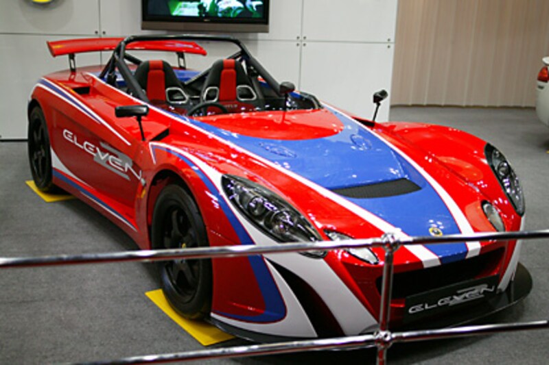 | 「軽量化による性能の向上」というコーリン・チャップマンの哲学を究極のレベルまで追求したトラックデイカー、ロータス2イレブン。1.8L 255psのエンジンをミッドシップに搭載するボディは、わずか670kg!パワーウェイトレシオ2.62kg/ps!エリーゼ用シャーシを基本としながら、ルーフもないサーキット専用のレーシーなエクステリア。前後にダウンフォースを発生させる巨大なスポイラーを備える。 |