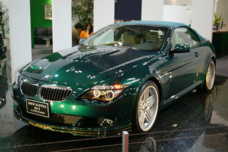 | BMW 6シリーズ カブリオレを元に、エンジン、サスペンションなどをチューニングし、エクステリア、インテリアをさらに豪華にしたBMWアルピナ B6 S カブリオレ スーパーチャ-ジャー。グリーンのボディ、幌、クリームのインテリアも美しい。 |