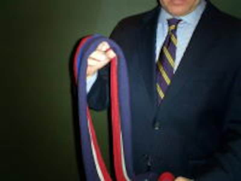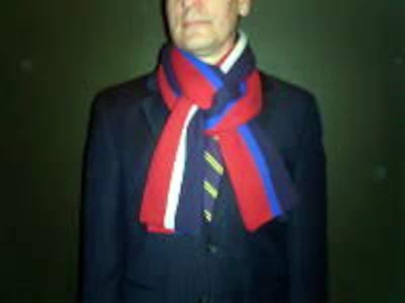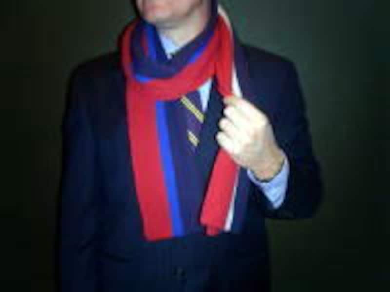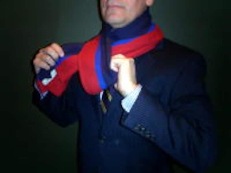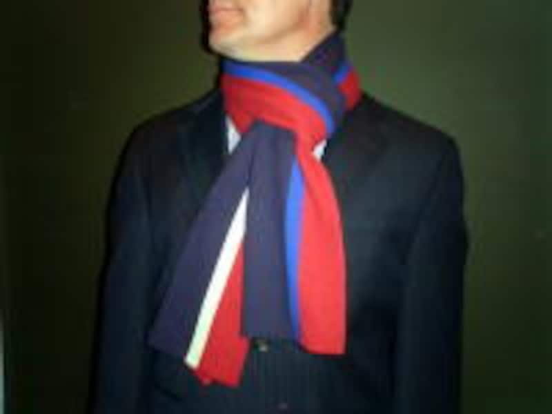 | 長いマフラーの裾を右の短いマフラーの下にくぐらせる。長いマフラーの裾を短いほうの下にしっかりと通し、左右両方の裾を少しひっぱりながら形を整えて、出来上がり。