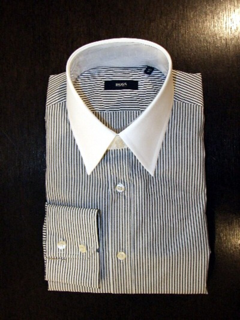 | ヒューゴ・ボスのクリレックシャツ。白い襟が品のよい着こなしのアクセントに。 |
