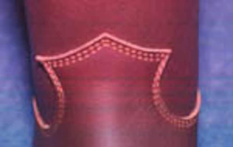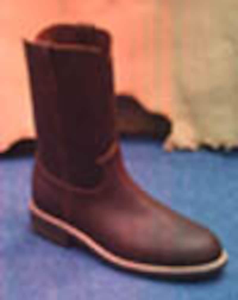 だから、ブーツ好きなら最後には必ず戻ると言われているペコスも作った。写真のディテール・カットを見てもらえばわかるように、接着して終わりの「ひっぱり」をアッパーに差し込み、縫い付けているし、筒立ち上り部はわざわざ王冠形状にカット。昔ながらの手の込んだペコスを忠実に再現してくれているのだ。ギアとしての機能面を付け加えとくと、バイクブーツは運転時の姿勢に合わせて筒まわりも前傾形状になっていて、歩きにくい。で、足首が出るように筒丈をカットすることで、筒の直角な立ち上がりが可能となった。細心の注意を払い、履き口にはパッドを入れたので、間違ってもギアチェンジで足を傷めるようなことはない。