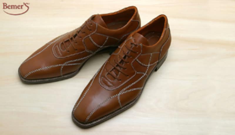 一言でいえば、そのテイストは「スポーツ」。しかし、従来の「スポーツ」という概念ではくくりきれない。それはもちろん、本格靴にスポーツテイストを融合させた「コロンブスの卵」的発想も大きいけど、それ以上に、そのステッチが描くデザインにオリジナリティを感じるからだ。ビスポーク・レーベル「ステファノ・ベーメル」でもフォルムとパターン、それに素材使いで本格靴だってまだまだ面白いことができるってことを証明して見せ、保守的な靴業界を驚かせたものだが、彼の精神性は「ベーメルズ」においても健在、いやむしろ、「ステッチで遊ぶ」という業界の禁じ手をフリーにしたことで一層、自由度が増した。
