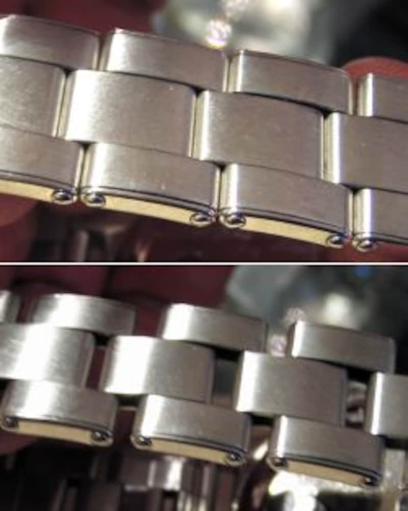 二つのステンレスのベルトの中でも特におすすめなのがオイスターブレスです。このデザインのアンティークベルトにはよく見掛ける、かつて流行した構造が再現されているのです。それが左の写真です。つまり引っ張ると接続部分が伸びるようになっているのです。