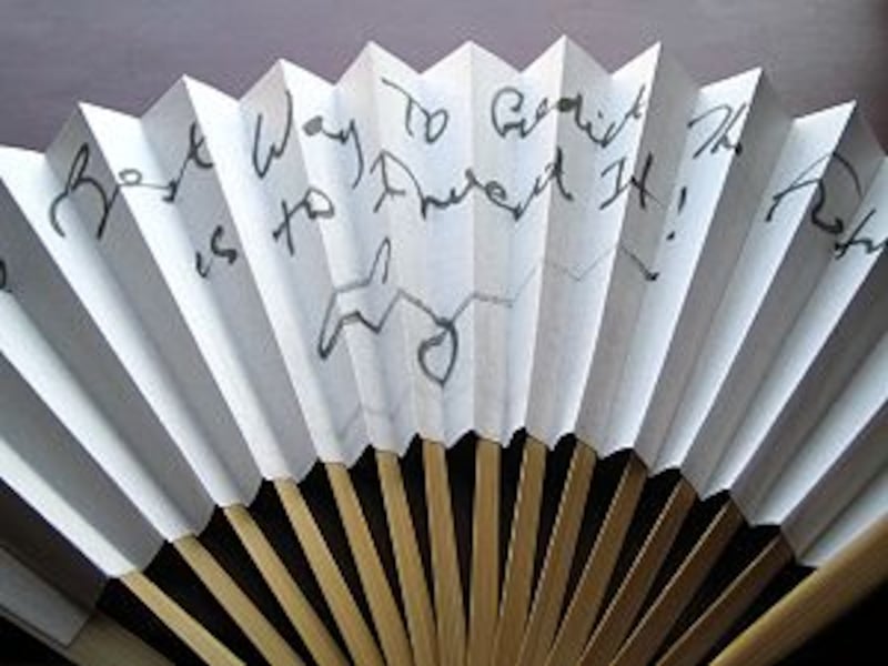 講談社が予約のみの限定生産で販売していた京極夏彦氏の絵をフューチャーした扇子。竹部分が狭く、紙も厚手なのですが、「これはキレイですよ」と彦いち師匠のお墨付きをいただきました。