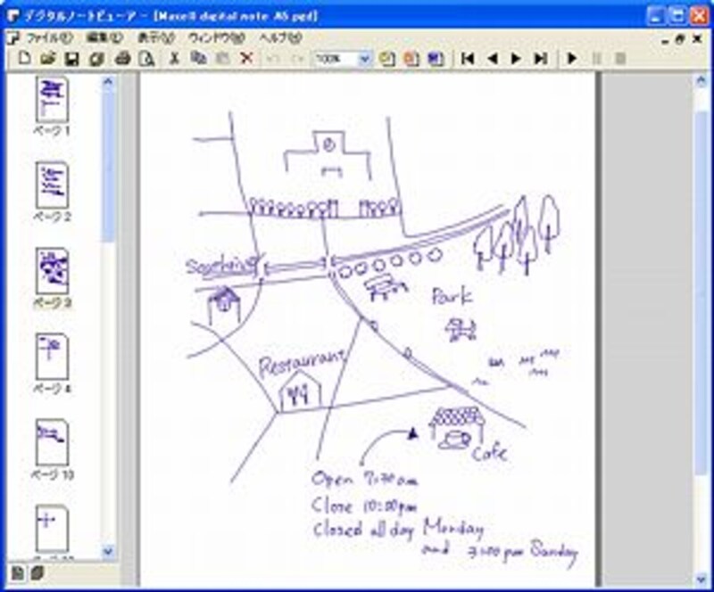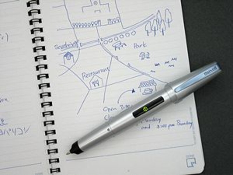 紙に秘密があり、ペンに保存するため、「PenIt」ではメモリユニットのようなものが不要です。専用のノートにペンで書くだけなので、はた目には普通にノートに描いているようにしか見えません。ページめくりの度にボタンを押す必要もないので、書いている時も、パソコン用のデータを作っている感じは全くないのが、「PenIt」の大きな特徴でしょう。本当に、普通にノートに書いているだけ、という感じなのです。
