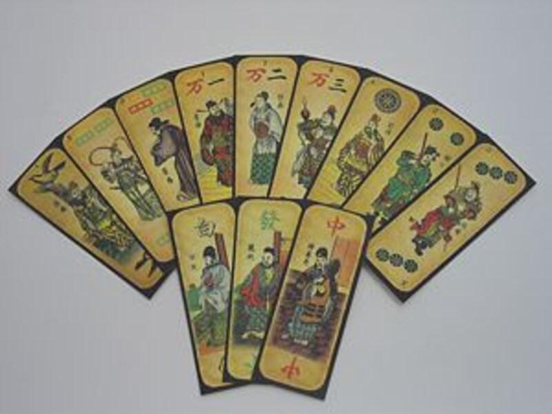 その細長いカードには、三国志のキャラクター達の絵が描かれています。万子(一万、二万などと書かれているカード)は魏の曹操、索子(竹をデザインしたマークのもの)は呉の孫権、そして筒子(丸をデザインしたマークのもの)は蜀の玄徳の元に集まった武将達が描かれています。東南西北のそれぞれのカードには三国志を彩る美女達が、白發中のカードは孔明、徐庶、鳳統の三人の軍師が描かれています。しかも、その絵が何とも、古い中国の絵画風で、しかも三国志好きの人が見ても納得出来るキャラクターになっています。