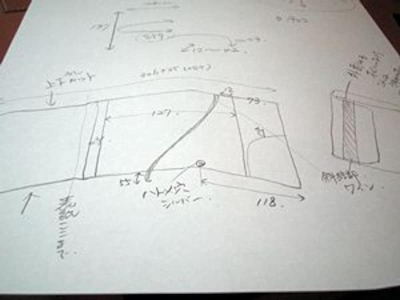 また、このお店で使われている革は、それはそれは上質なもので、そのレベルはエルメスなどと比べても引けを取りません。どうせ作るなら、「究極のブックカバー」と呼べるようなものを作りたいと思ったので、革にもこだわりたかったのです。オーソドキシーさんに予約のメールを入れて、まずはスタッフの今野さんと打ち合せです。上の写真は、その時の打ち合せで今野さんに書いていただいた設計図。