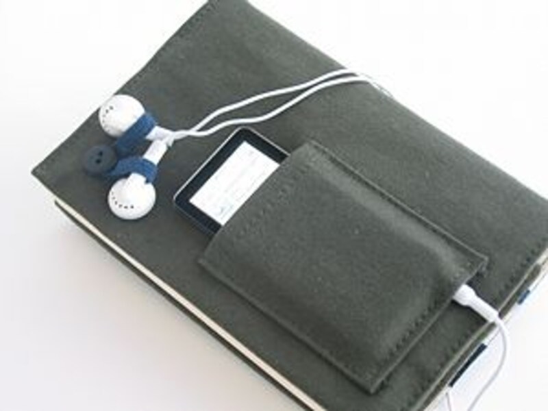 そこでガイド納富も、前にガイド記事で紹介した「特製ブックカバー」にもnanoポケットとヘッドフォンを引っ掛けるゴムを付けて、「ブックカバー・ナノ」を作ってみました。nano部分がグリップの代わりになって本のホールド感が良く、使ってみたら、中々良い感じでした。