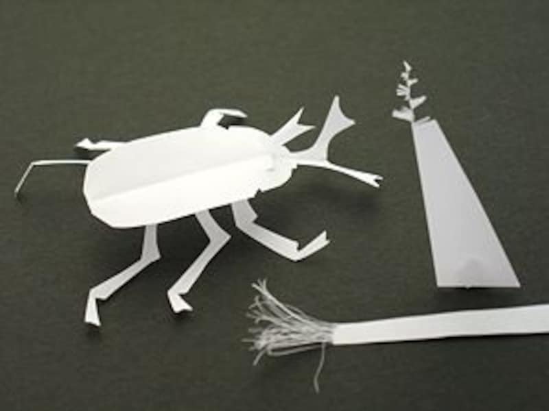 「嫌いになるきっかけがなかったんですよ」という高畑さんの言葉は、要するに子供の頃からずーっと文具が好きで、今もそれが変わっていないということ。「誰でも子供の頃には文具に興味を惹かれる時期があるじゃないですか。それに、僕の場合、父親が技術者だったせいか、子供の頃からオモチャは買ってもらえなくても、道具は買ってもらえたんです。それで、子供の頃から図画工作が得意で、そのままずーっと道具を使ってきたし、道具が好きなままなんです」そんな風に高畑さんはご自身の文具好きについて話されました。そんな話をしながら、愛用のハサミをとり出して作って下さったのが、写真のカブト虫とツリーのペーパークラフトです。
