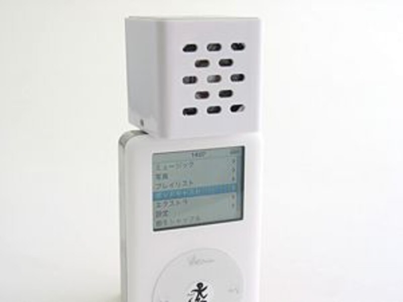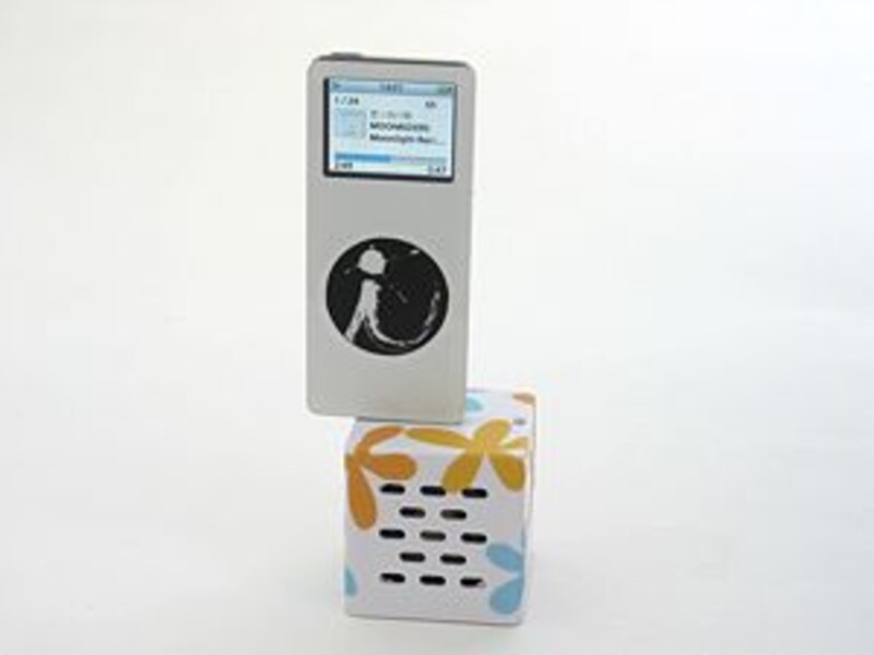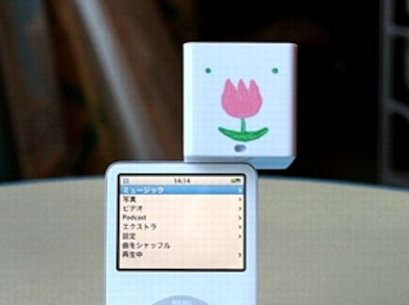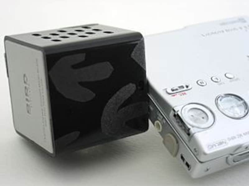 バード電子の「サイコロスピーカー」は、見ての通りの手のひらサイズのキューブ型スピーカー。この1辺約45mmの小さなキューブにはステレオスピーカーが仕込まれていて、上部に突き出したプラグにiPodやネットウォークマンを差し込めば、それだけで音楽が楽しめてしまうのです。