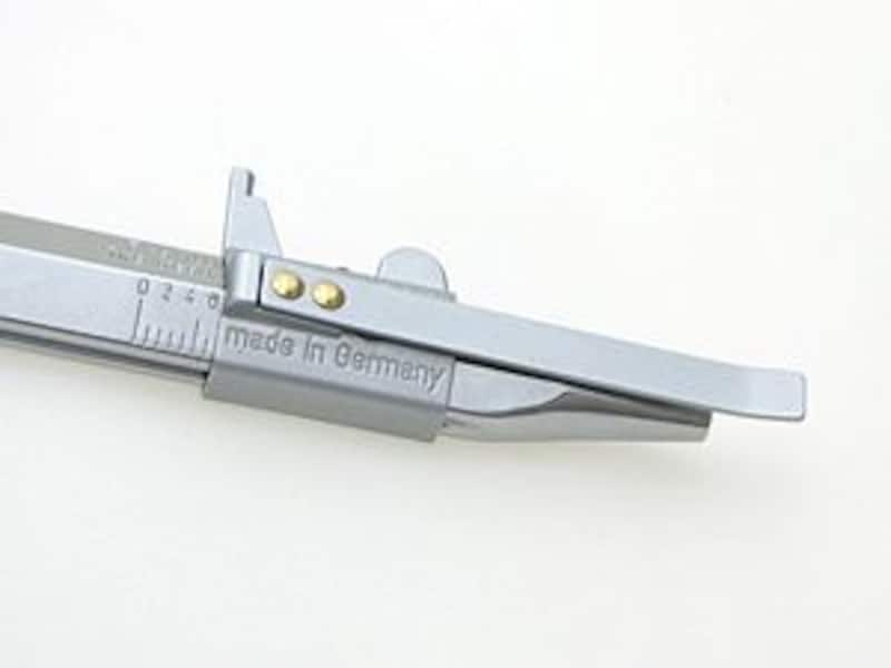 それでも、ここまで精巧なノギスを筆記具と組み合わせる必要というのは日本ではあまり考えられません。でも、ドイツではこの道具はかなりの実用品なのだそうです。その大きな利用目的は、自動車のタイヤの溝の深さを測るためなのです。ドイツは、溝が浅いタイヤの取り締まりが厳しいらしく、マメにタイヤの溝の深さをチェックする必要があるのだそうです。
