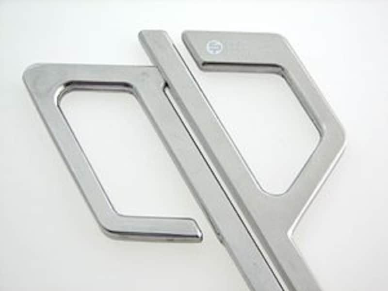 ステンレス製で全体にヘアライン仕上げが施されているのはフィスカースと同じ。これはハサミの一つの完成されたスタイルなのでしょう。グリップ部分の独特な形は、いかにもデザインデザインしたものですが、このハンドルが左右両用になっているのです。つまり、左右両用を実現するために、この形があった訳です。