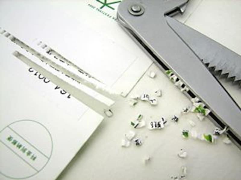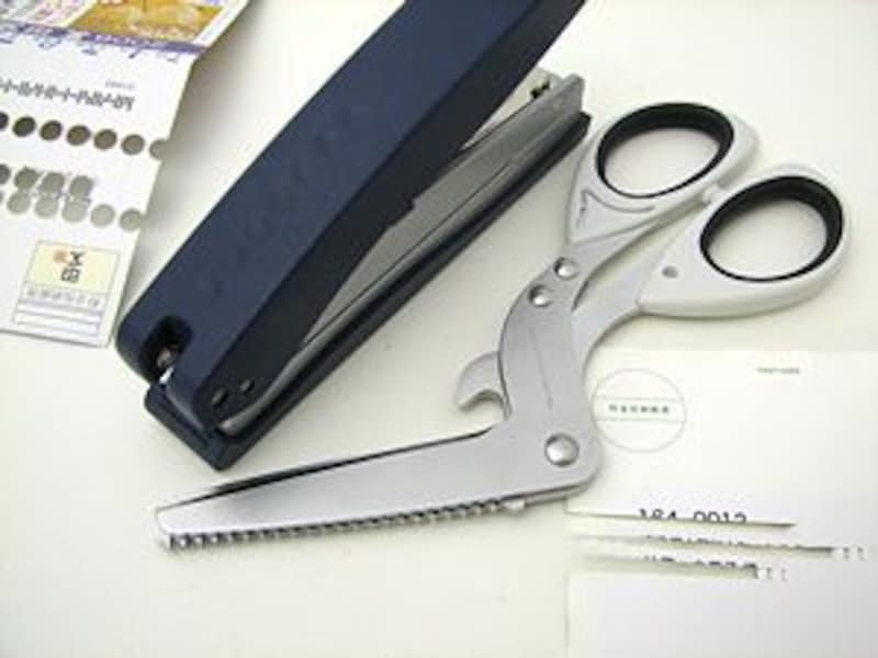 パーソナルなシュレッダーとして、name-offと共に持っていたいのが、サンスター文具の「シュレッダーはさみ」です。name-offが、狙った数センチの情報を一回の操作で消してしまうツールなのに対し、このシュレッダーはさみは、ジョキジョキと情報を粉砕しながら切り進むツール。つまりハガキならname-off、封書ならシュレッダーはさみ、といった感じの使い分けが行えます。