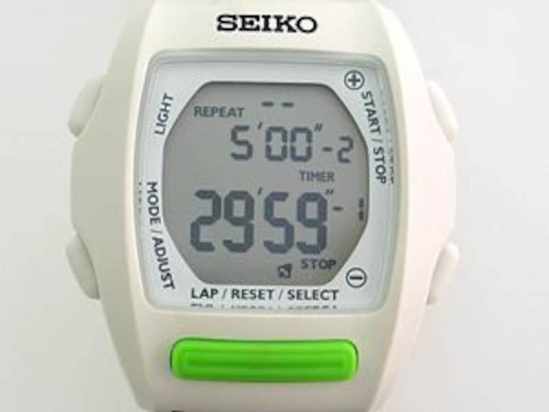 他にも、通常のアラームに加え、反復練習用のダブル・リピートアラームも搭載されています。例えば、30分走ったら10分歩く、といったトレーニングを5回行いたい場合、アラーム1を30分に、アラーム2を10分にセットして、リピート回数を5にセットします。これで、30分でアラームが鳴り、次に5分後に鳴るというパターンを5回繰り返してくれるのです。