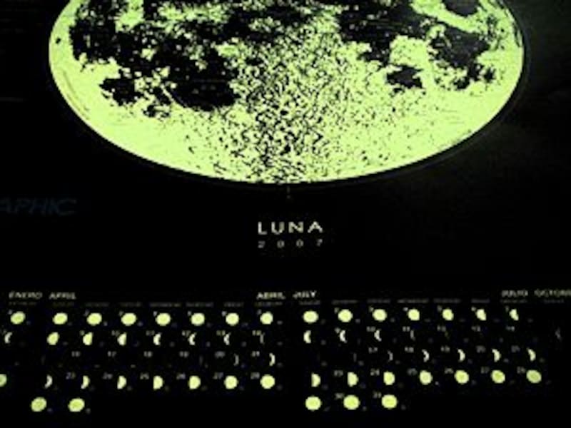 蓄光インクによる印刷で、月面とカレンダー部分が光る |
