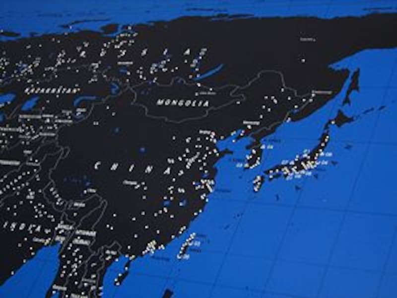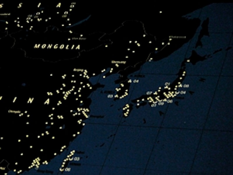 デザイン面では、部屋に貼っていて邪魔になりにくい世界地図をモチーフにしたものをいくつも作っていることも、野方電機工業の「Lbtb」シリーズの特徴でしょう。中でもガイド納富は、衛星から見た地球の夜を世界地図上で再現した「NIGHT PLANET 夜景地図カレンダー」がお勧め。夜の地球の明るい部分が分かるということは、部屋を暗くすれば、一目でエネルギーの大量消費が行われている場所が分かるということでもあります。また火力、水力、原子力の各発電所の位置も記されていて、キレイなだけではない面白さ興味深さが含まれているのです。
