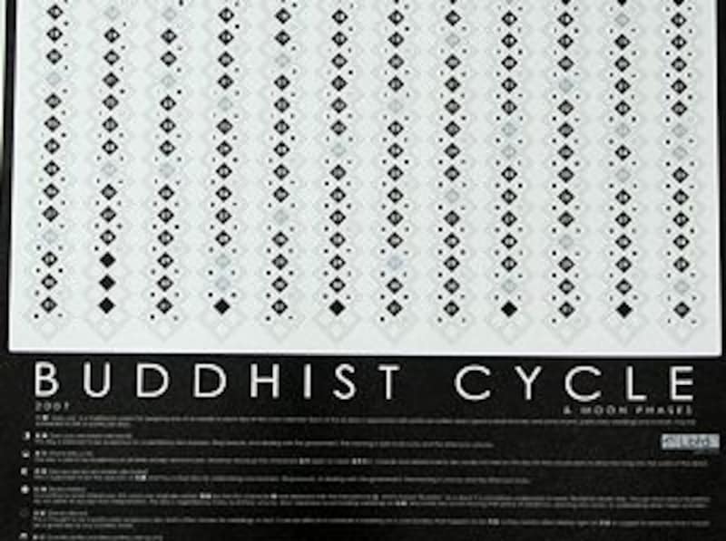 ガイド納富が個人的に好きなのが、六曜を月齢に似た記号にすることで、まるで月齢と日付と六曜のマンダラみたいなデザインになっている「BUDDHIST CYCLE 六曜カレンダー」です。モノトーンでまとめられたシンプルなデザイン(2006年版は朱色でしたが)に必要な情報がまとめられたコンパクトな感じと、数字や月齢記号が何か秘密の暗号のようにも見える配置、そしてA2サイズの手軽さと、何より1年1枚タイプで六曜が付いている便利さが魅力です。