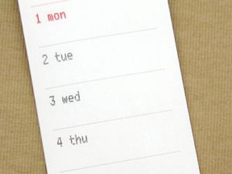 そんな実用本位の一ヶ月タイプのカレンダーに、デザイン性と遊び心を加えたのが、no quietの「レシート・カレンダー」です。レジスターのレシートそのままのデザインで、縦に一ヶ月分の日付が印刷されています。ほとんどそれだけと言っても良いシンプルなデザインですが、これが意外に見易く使いやすいのです。縦に日付が下がっていくタイプは、週を勘違いすることも少なく、日をまたぐ予定なども書き込みやすく、柱などにも貼れるので場所を選ばないなど、その便利さは、使ってみると実感できるはずです。