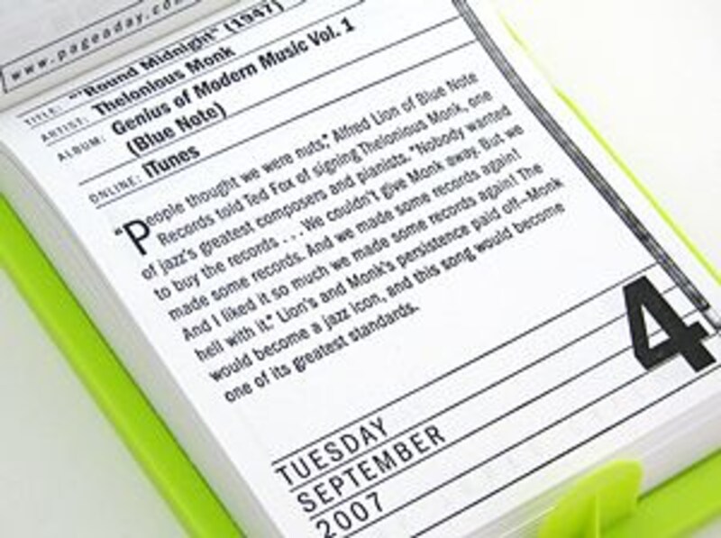 Workman Publishing社「365 Tunes Calender」(2289円)も、そういう、その日の情報を表示するタイプですが、このカレンダーが面白いのは、その情報が「曲」なのです。つまり、一日一曲、ロックやジャズ、ポピュラーミュージックを紹介してくれます。しかも、その曲はiTunesでダウンロードして聴ける曲ばかりなので、カレンダーを見て興味が湧けば、すぐに聴くことさえ出来るわけです。