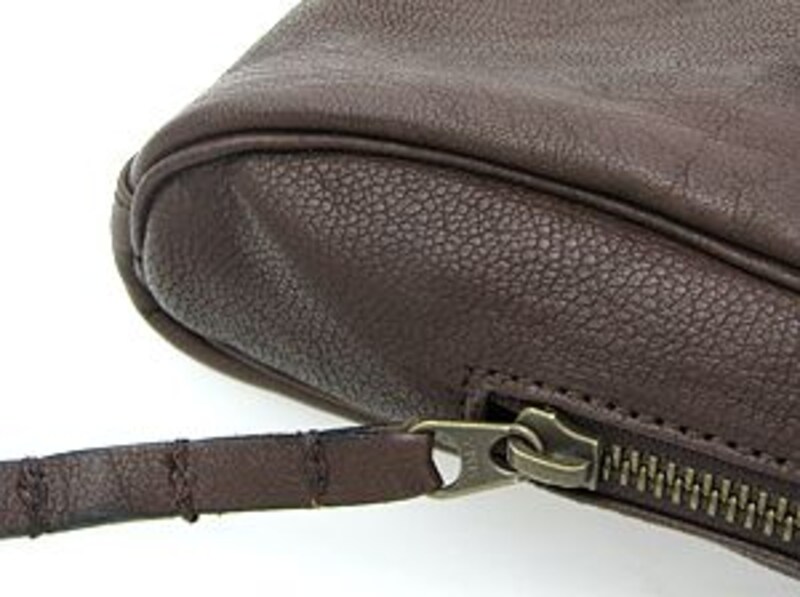 使われているのは、柔らかいけれど、しっかりした肌合いを持つタンニン鞣しの山羊革。牛革ほど繊細でなく、傷がつきにくく柔軟な山羊革は、毎日ハードに使うポーチには最適の素材。年齢性別を問わない質感のフラットな感じで、ワイルドにも見えるし端正にも見えるので、服装を選びません。金具部分も、しっかりとしたものが付いていて、縫製も頑丈と、毎日使うことを前提に作られています。