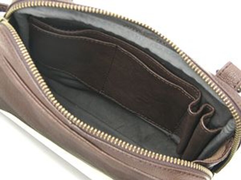 この「MARSUPIO」は、通常のポーチとしても小さい方ですが、必要なモノを入れて、入らなくて困るということが、あまりないようになっています。それは、携帯電話は側面にいれて、内部はスッキリと大きく開けられるようになっているからです。また、いっぱい詰めても、パンパンになった感じがしない、山羊革の柔らかいけれど弾力のある素材感が、見た目無理しているように見せません。