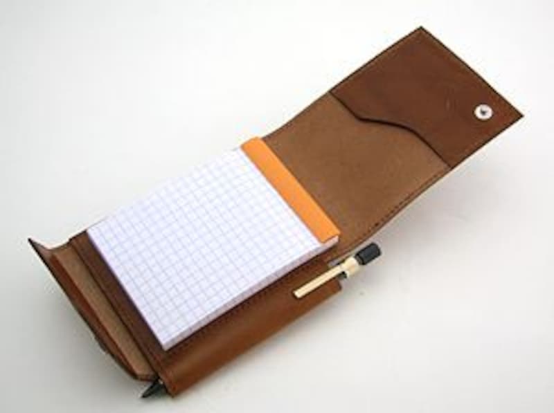 さらに、書いて切り取ったメモを収納するポケットが、フリップ裏と背面の二ヶ所に用意されていて、名刺入れにも使えます。フリップはホックで留めるので鞄の中で開いてしまい、メモ紙が曲がったりすることもありません。