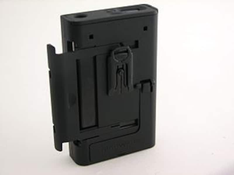その上で、ケースの裏側には、イヤフォン用のケーブルを巻き取るためのリールや、ビデオを見る時のiPodを立てるためのスタンド、腰に付けるためのアタッチメントを装着するフックなどが用意されていて、必要に応じて、出し入れすることが出来るのです。イヤフォン用のリールは、ケースの側面から引っ張り出せるのですが、これが「サイドワインダー」という名前の由来になっているようです。