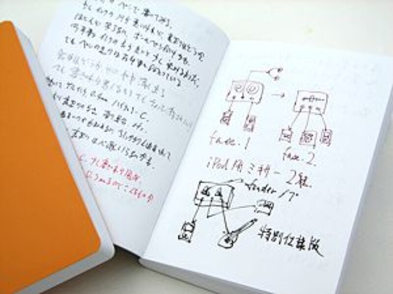 その分、書いた内容の読みやすさは、この手の綴じノートの中でもナンバーワンだと思うのです。背表紙が丸く曲線を描いているのに、小口は水平という、ちょっと他にはない製本スタイルは、しかし、本当にパラパラとめくりやすく、手にしっくりと収まります。ページ数も240ページ(モールスキンはポケットが192ページ、ラージが240ページ)と、十分なボリューム。一つのアイディアに一冊という感じで使えます。
